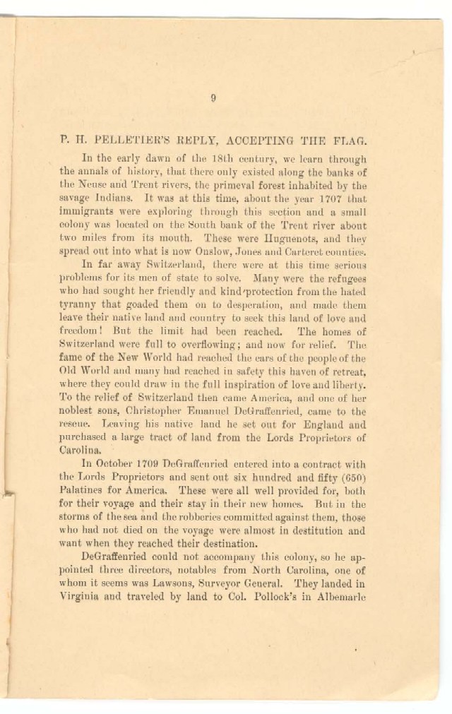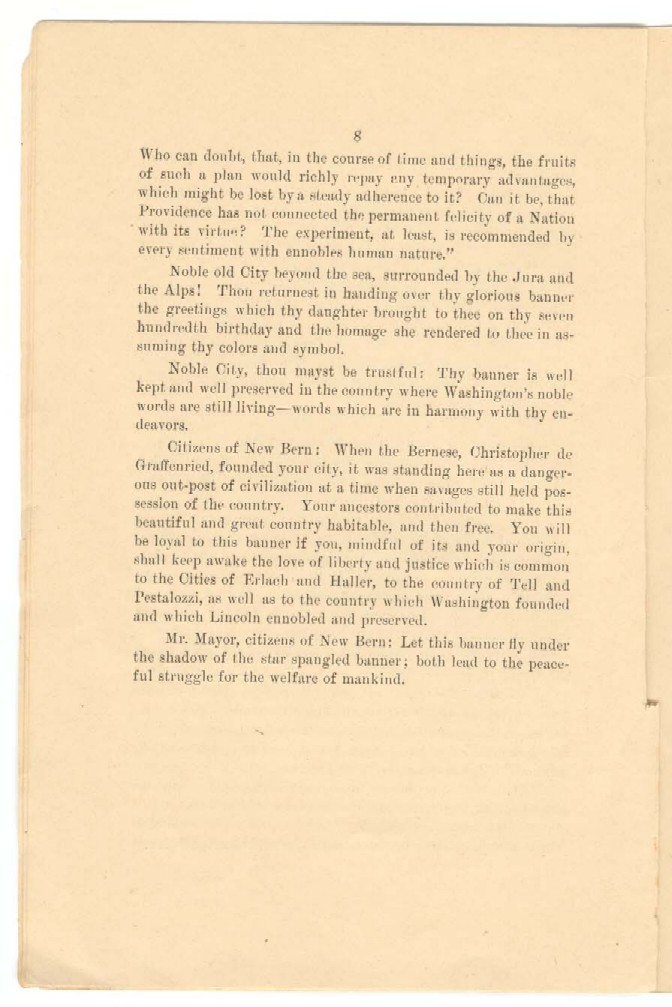 Citizens of New Bern: When the Bernese, Christopher de Graffenried, founded your city, it was standing here as a dangerous out-post of civilization at a time when savages still held possession of the country. Your ancestors contributed to make this beautiful and great country habitable, and then free. You will be loyal to this banner if you, mindful of its and your origin, shall keep awake the love of liberty and justice which is common to the Cities of Erlach and Haller, to the country of Tell and Pestalozzi, as well as to the country which Washington founded and which Lincoln ennobled and preserved.