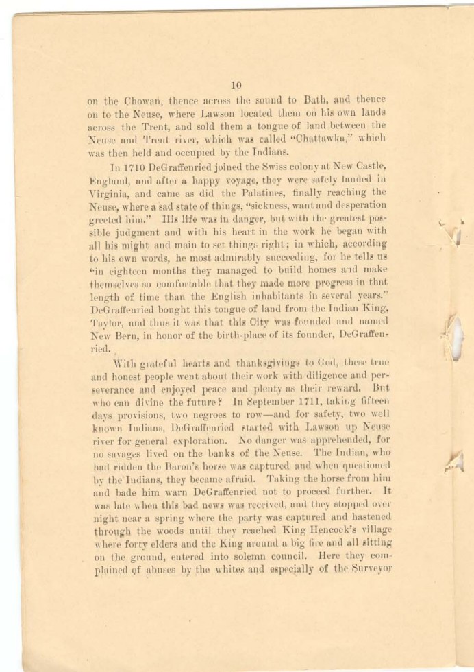 In 1710 DeGraffenried joined the Swiss colony at New Castle, England, and after a happy voyage, they were safely landed in Virginia, and came as did the Palatines, finally reaching the Neuse, where a sad state of things, “sickness, want and desperation greeted him.” His life was in danger, but with the greatest possible judgment and with his heart in the work he began with all his might and main to set things right; in which, according to his own words, he most admirably succeeding, for he tells us “in eighteen months they managed to build homes and make themselves so comfortable that they made more progress in that length of time than the English inhabitants in several years.” DeGraffenried bought this tongue of land from the Indian King, Taylor, and thus it was that this City was founded and named New Bern, in honor of the birth-place of its founder, DeGraffenried.