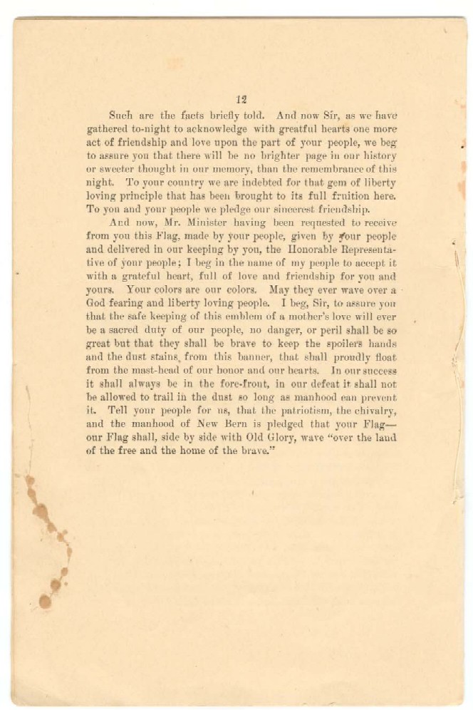 And now, Mr. Minister having been requested to receive from you this Flag, made by your people, given by your people and delivered in our keeping by you, the Honorable Representative of your people; I beg in the name of my people to accept it with a grateful heart, full of love and friendship for you and yours. Your colors are our colors. May they ever wave over a God fearing and liberty loving people. I beg, Sir, to assure you that the safe keeping of this emblem of a mother’s love will ever be a sacred duty of our people, no danger, or peril shall be so great but that they shall be brave to keep the spoilers hands and the dust stains, from this banner, that shall proudly float from the mast-head of our honor and our hearts. In our success it shall always be in the fore-front, in our defeat it shall not be allowed to trail in the dust so long as manhood can prevent it. Tell your people for us, that the patriotism, the chivalry, and the manhood of New Bern is pledged that your Flag— our Flag shall, side by side with Old Glory, wave “over the land of the free and the home of the brave.”