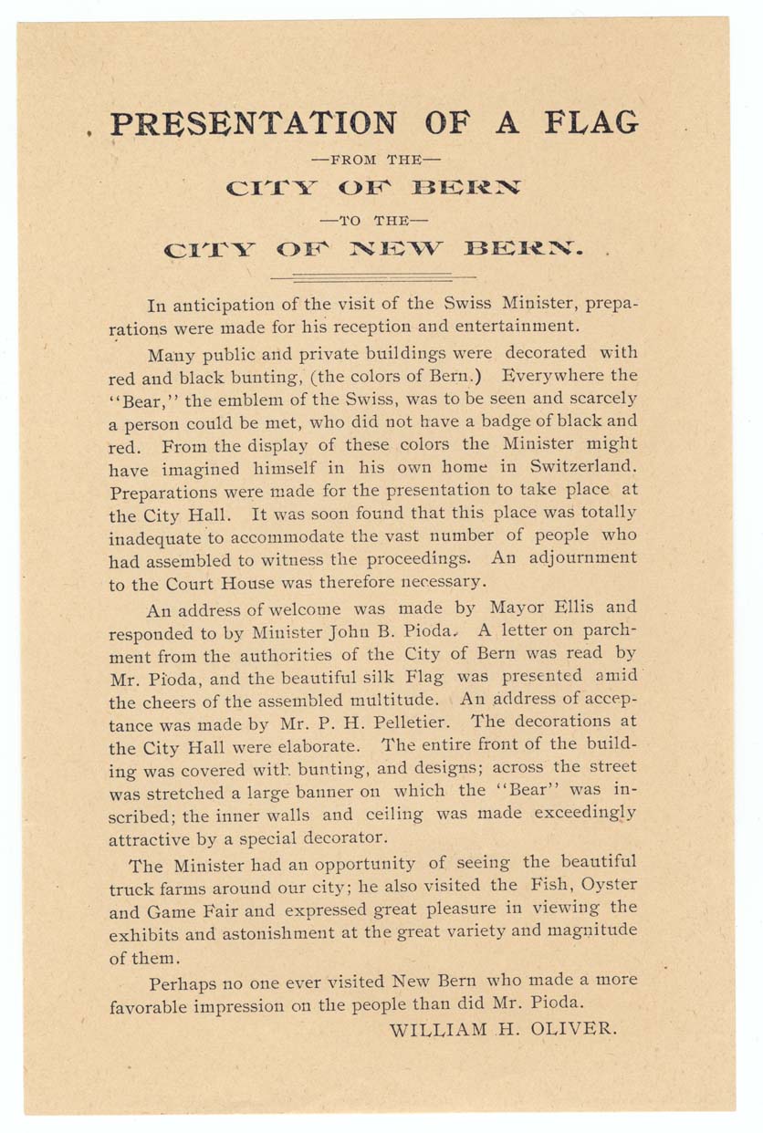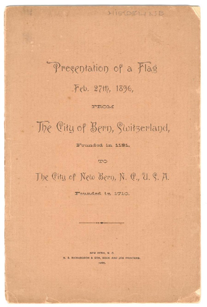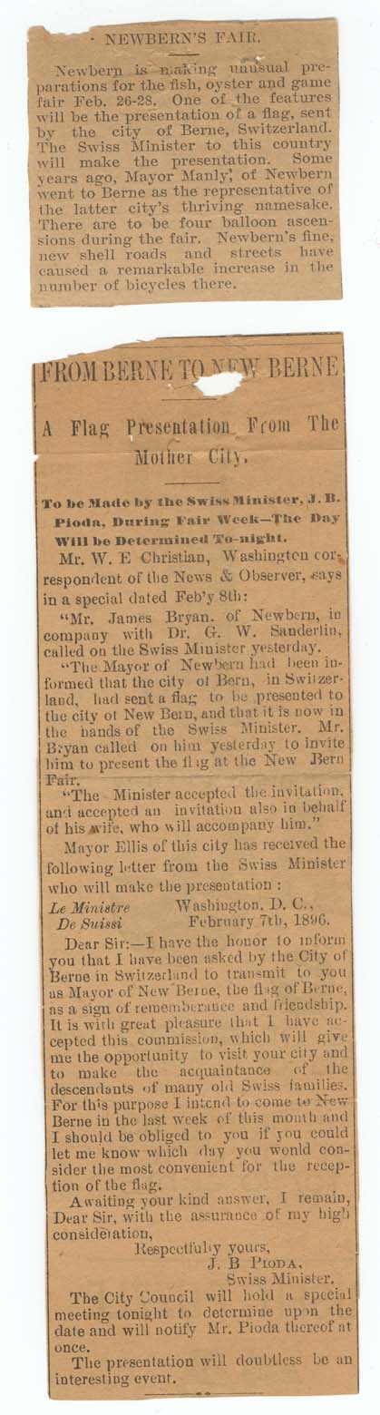 “The Mayor of Newbern had been informed that the city of Bern, in Switzerland, had sent a flag to be presented to the city of New Bern, and that it is now in the hands of the Swiss Minister. Mr. Bryan called on him yesterday to invite him to present the flag at the New Bern Fair.